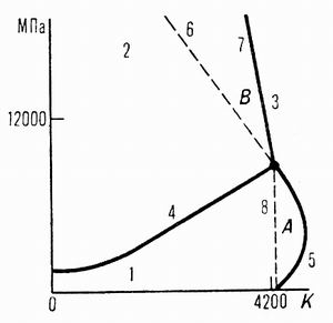 Рис. 2. Диаграмма состояния углерода: 1 и 2-области устойчивости соответственно графита и алмаза; 3-область существования расплава углерода; 4-линия равновесия графит-алмаз; 5, б, 7, 8 -линии плавления соответственно графита, метастабильного графита (приблизительная граница существования метастабильного графита в поле алмаза), алмаза и метастабильного алмаза в поле графита (приблизительная граница); А и В-области существования термодинамически неустойчивых алмаза и графита соответственно. |